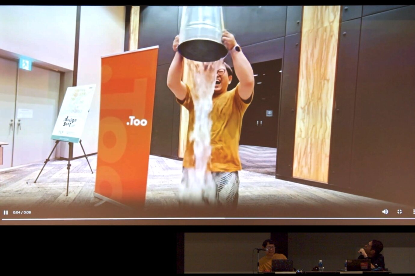 さらに、その画像をボタンひとつでウェブ版のFireflyに送って動画を生成しました。時間の都合であらかじめ生成していたものですが、「バケツの水を頭からかぶって楽しそうに慌てる様子」の岩本さんの動画が音声付きで完成しました。大声で笑いながら水をかぶるシュールな動画に会場は微妙な空気になりましたが、「皆さん引いてます?」のひとことで笑いが起きて一安心でした。