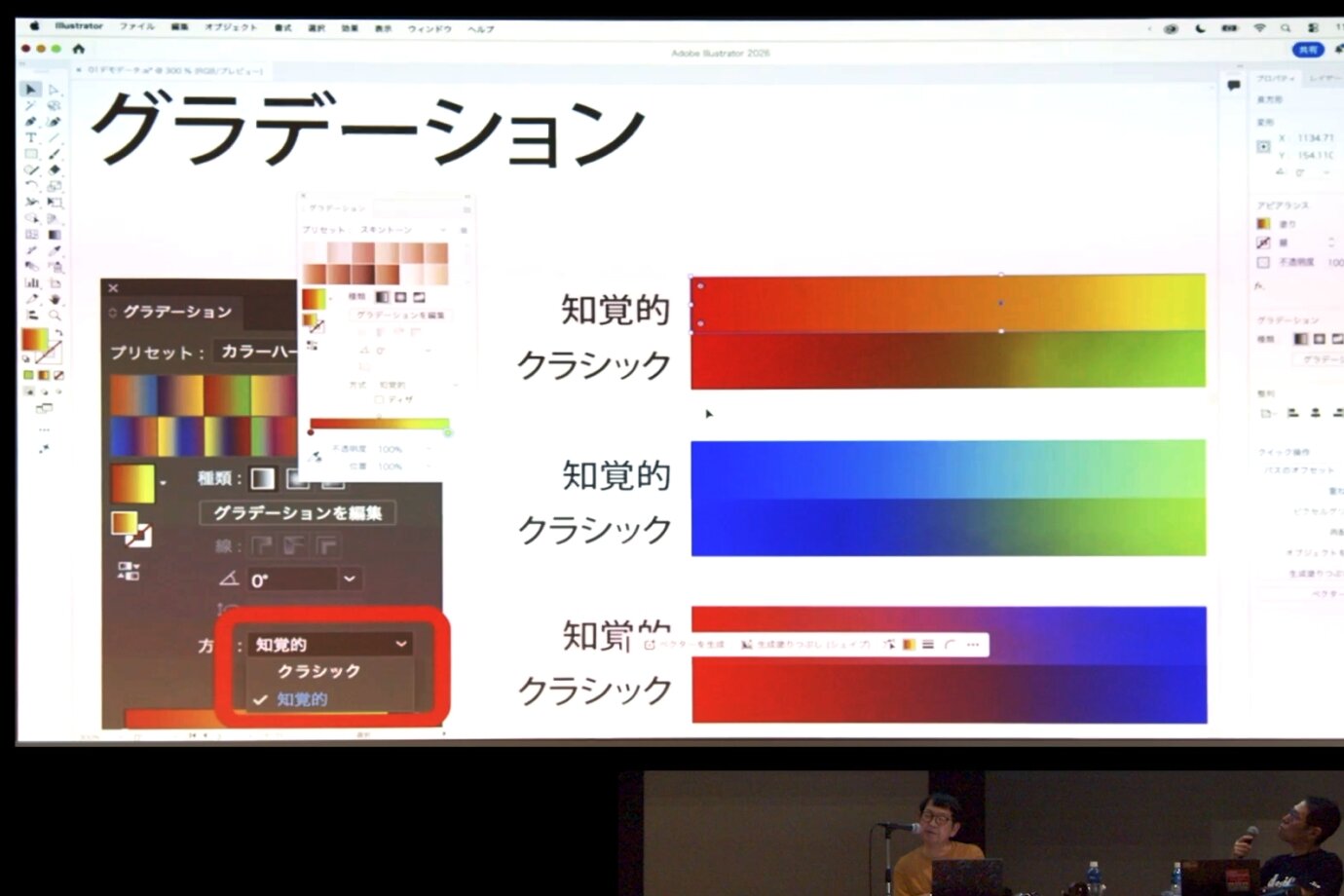 Illustratorの代表的機能であるグラデーションには、プリセットが増えたことに加え、「視覚的」という方式が登場しました。従来の方式「クラシック」ではビビッドな色などで中間が濁ったりトーンジャンプすることがありましたが、「視覚的」ではきれいに扱えるよう調整されています。なお、「視覚的」はRGBベースの処理のため制限事項があることには注意が必要です。