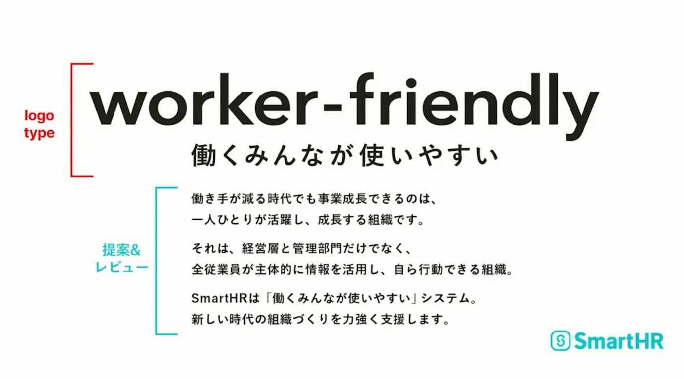 次に、SmartHRの「これから」を象徴する事例として、新サービスビジョン「worker-friendly」のコミュニケーションデザインについて田嶋氏が紹介しました。
