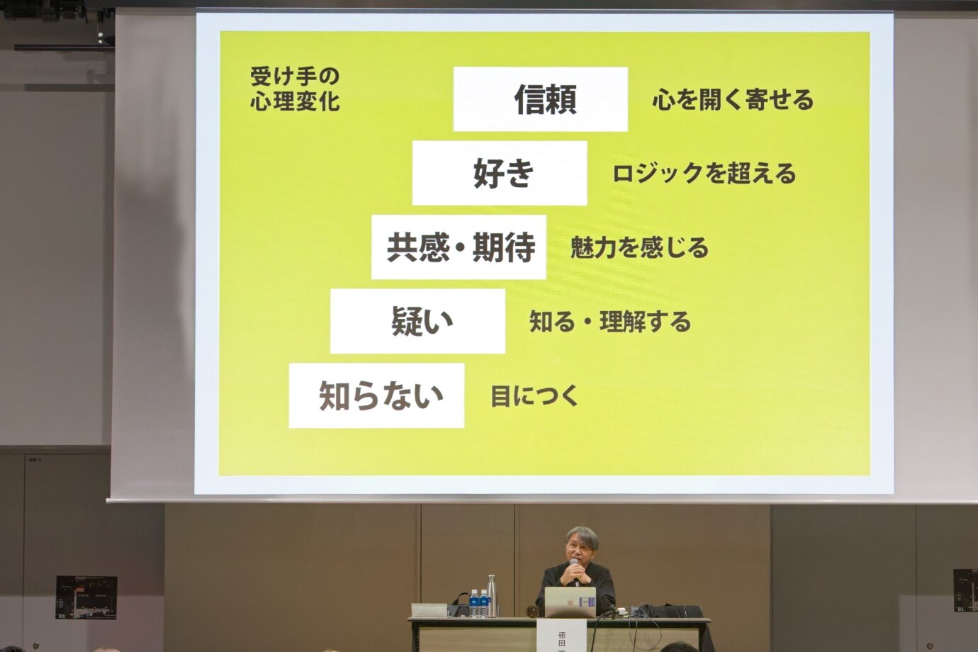 ブランドが人々に受け入れられるまでには、「知らない → 疑い → 共感・期待 → 好き → 信頼」という段階的な心理変化があります。中でも徳田氏が強調したのは、ロジックを超えた「好き」の重要性です。数値や情報では測れない「好き」の感情が続くことで、人はモノや会社に心を寄せていき、信頼・ブランドが生まれるのです。