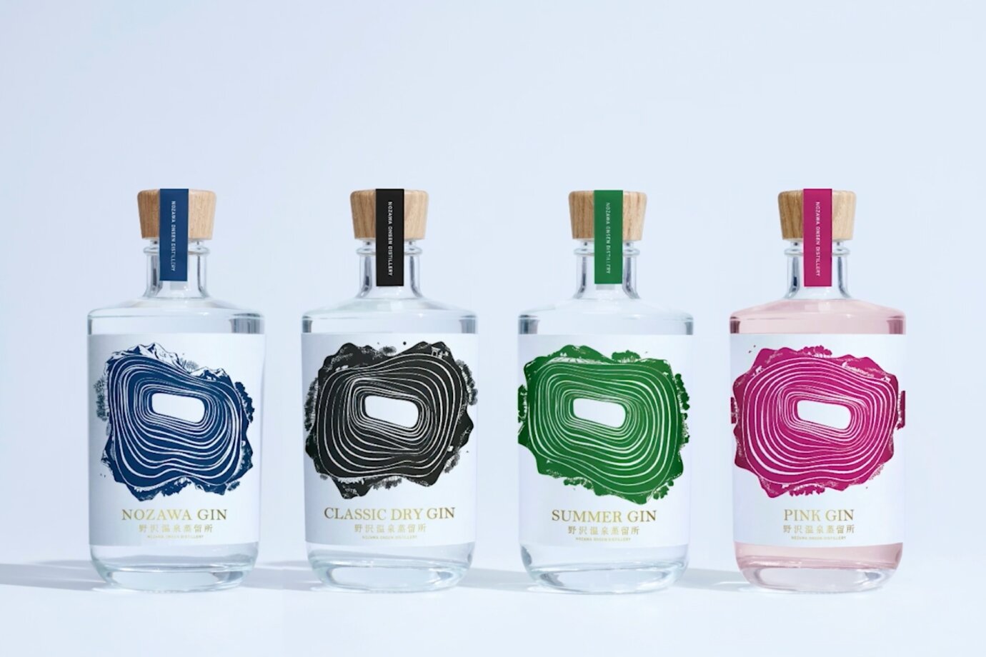 4種のボトルのラベルには、それぞれ異なる水の流れが描かれています。一方で、すべてのマークの中央部分は共通していて、そこが野沢温泉蒸溜所のロゴマークになるという仕掛けが施されています。