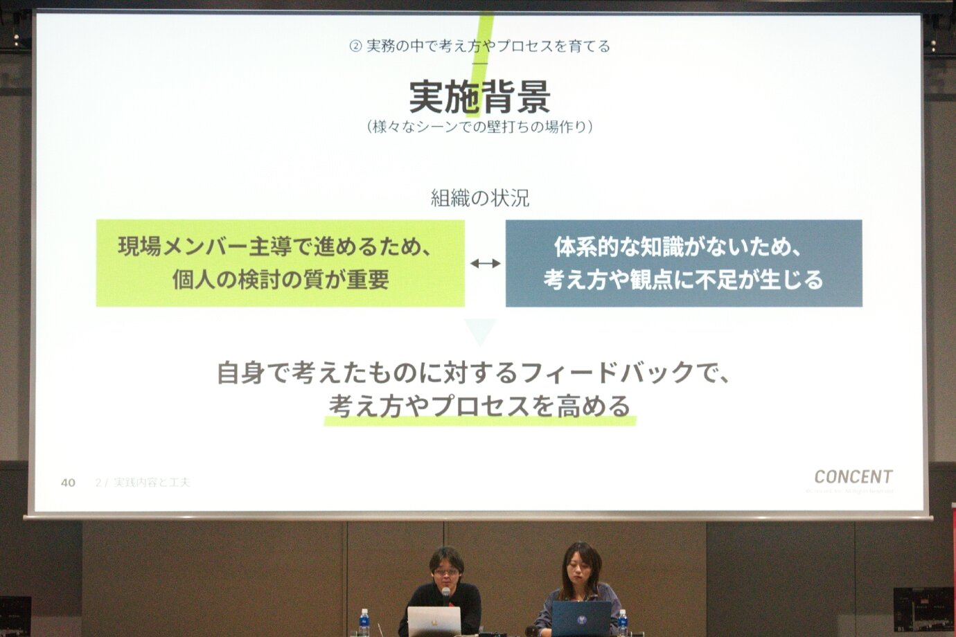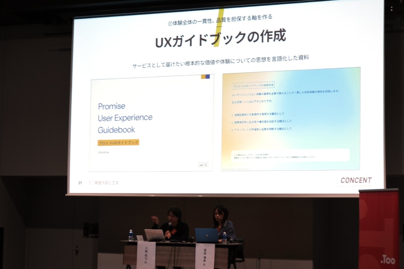 株式会社コンセントのサービスデザイナー八尾拓斗氏とSMBCコンシューマーファイナンス株式会社の富田瑞希氏に登壇いただき、デザイナーが作り手としてではなく、顧客中心の視点や考え方、プロセスを組織に広げる役割を担う──そんな新しい共創のかたちについて、両社の取り組みをもとに紹介しました。